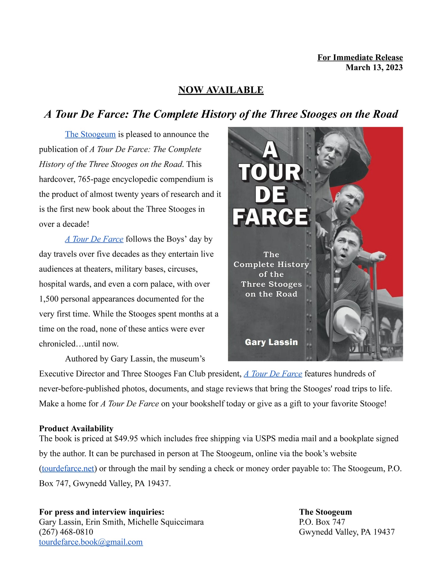 Announcing the release of A Tour de Farce: The Complete History of the Three Stooges on the Road by Gary Lassin.